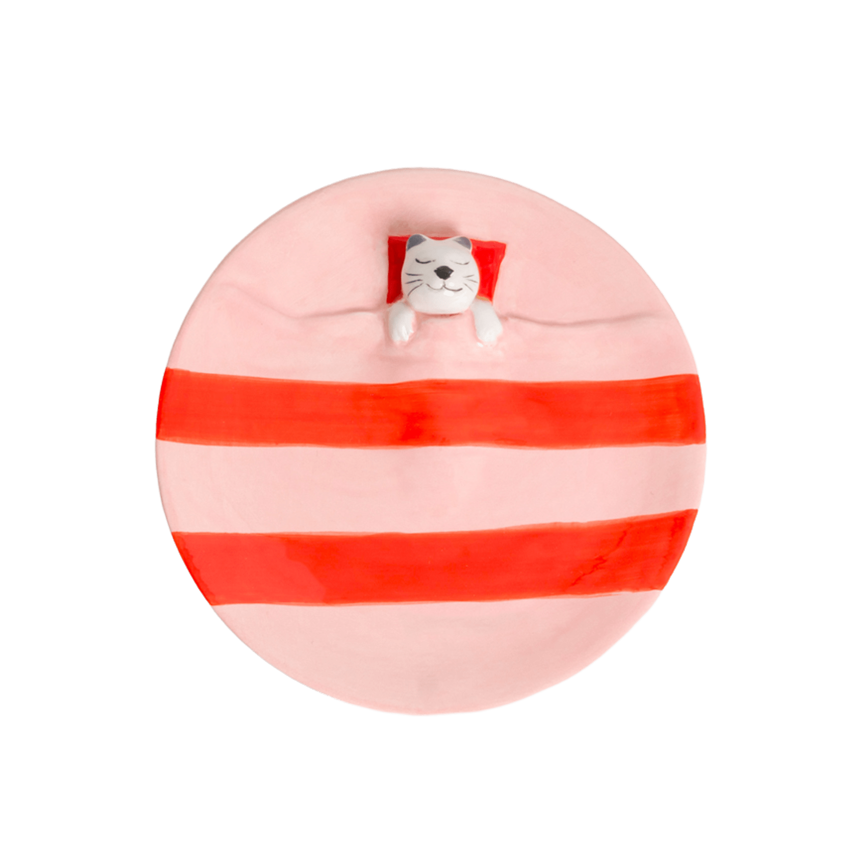 Bandeja joyero en tono rosa con ilustración de un gato soñador. Su diseño abierto permite organizar y tener a la vista anillos, collares o pulseras. Combina funcionalidad con un estilo dulce y encantador. MIAU 🐈