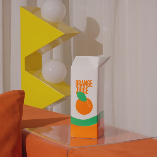 Jarrón de cerámica con forma de botella de zumo de naranja.