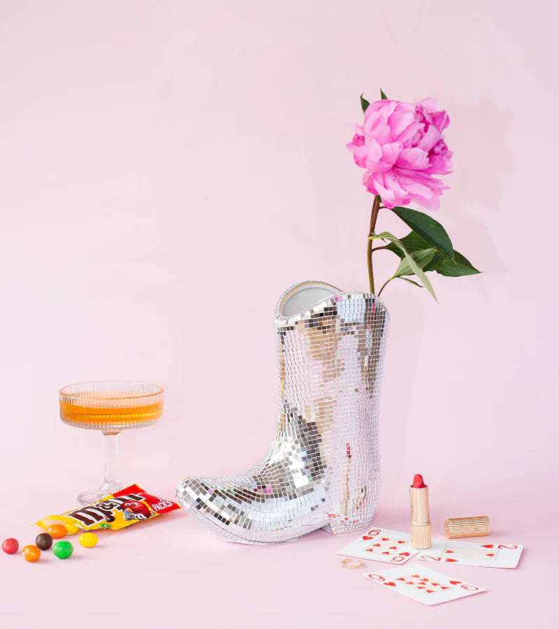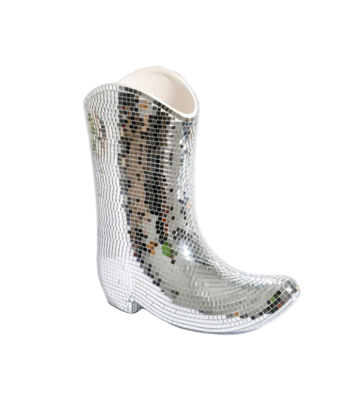 Déjate seducir por el brillo irreverente de este jarrón Santiag, completamente recubierto de mosaicos de espejo. Verdadera pieza statement de decoración, fusiona el espíritu rebelde del Lejano Oeste con la energía vibrante de las noches disco. Perfecto para lucir un ramo atrevido o brillar como pieza central, este jarrón rompe las convenciones y celebra la excentricidad con estilo. 🪩🤠